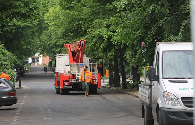 Als die Prenzlberger Stimme noch am Vormittag am Ort des Geschehens erschien, waren die Entastungsarbeiten, die im Auftrag des Pankower Grünflächenamtes an den Straßenbäumen vorgenommen wurden, noch im vollen Gange.