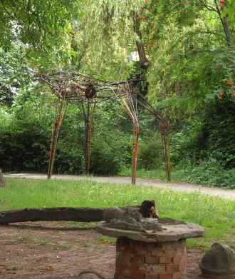 Um Flurstücksgrenzen oder gar Eigentumsverhältnisse hat sich damals keiner gekümmert. Warum auch? Es ahnte ja niemand, daß das zwanzig Jahre später als Sakrileg angesehen werden würde. Vor der Hand war wichtiger, landschaftsplanerischen, gärtnerischen und künstlerischen Sachverstand aus der Nachbarschaft zusammenzuführen. Nach dem aus Schrott und Alltagsgegenständen zusammengeschweißten Hirsch des Bildhauers Stefan Reichmann, durch dessen Beine hindurch man den Hof betrat, hat dieses Stück Land seinen Namen.