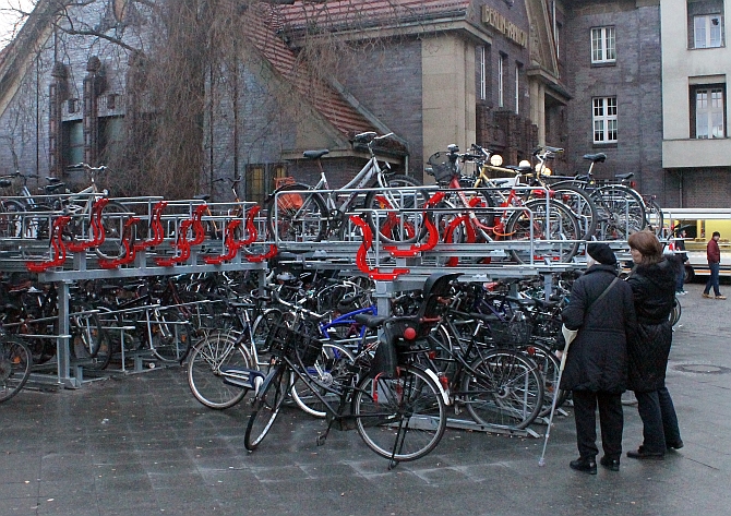 Vor allem an den S-Bahnhöfen: Ein Gedränge von abgestellten Drahteseln. Kaum noch ein freies Eckchen, und auch hier die Erkenntnis: Grund und Boden kann nicht vermehrt werden, ein Quadratmeter bleibt ein Quadratmeter. Es sei denn…. – man geht in die Höhe.