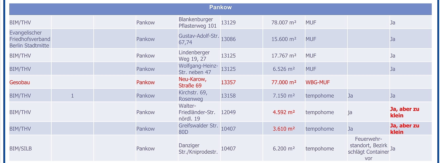 In einer heute (Donnerstag) vom Bezirksamt Pankow veröffentlichten Mitteilung heißt es dazu, die „Flächen in Prenzlauer Berg werden derzeit vom Senat erneut auf Eignung geprüft“.