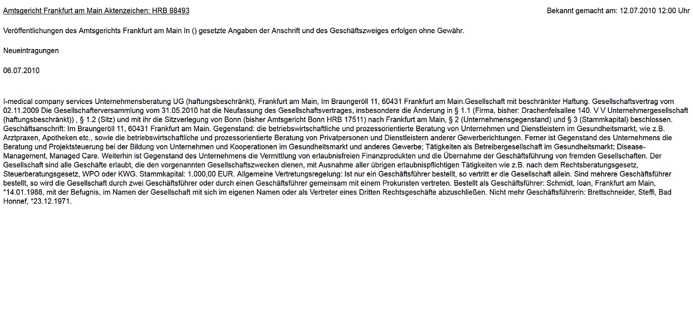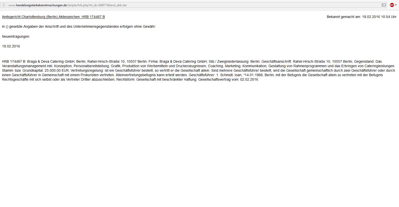 Eine durchaus bemerkenswerte Begründung. Allerdings scheint dieses Geschäftskonzept bei Schmidts aktueller Neugründung nicht mehr zu gelten. Die „Braga & Deva Catering GmbH“ wurde von Schmidt – fast auf den Tag genau drei Monate nach seinem Einstieg in das Flüchtlingsunterkunftsgeschäft – mit satten 25.000 Eigenkapital ausgestattet.