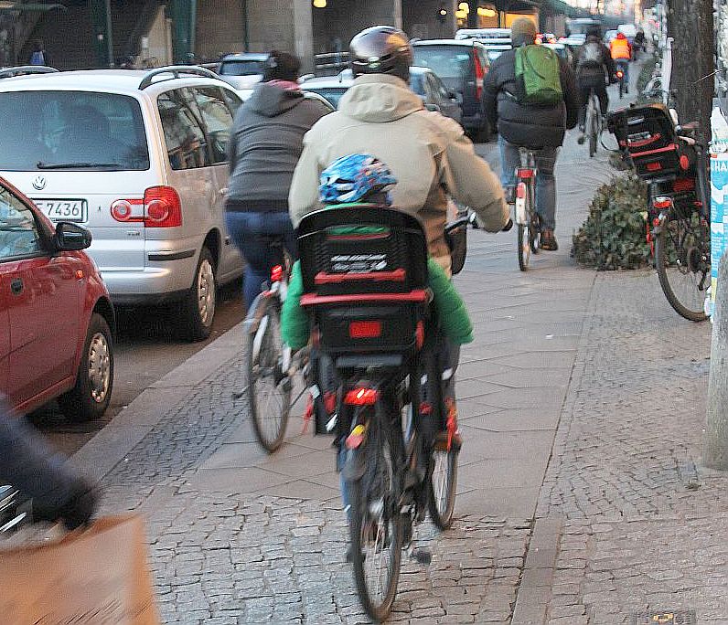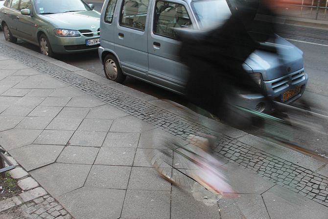 Dennoch meiden die meisten Radler die von Autos dominierte Fahrbahn und zuckeln über das mitgenommen wirkende Radwegpflaster.