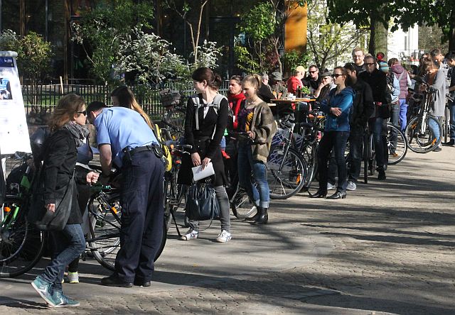 Die Schlange der Fahrradmarkierungswilligen wurde nicht kleiner, und der Spielplatz nicht leerer. Im Platzhaus aber fanden sich gerade mal zehn Personen zusammen: Drei von der Polizei, der Bezirksstadtrat, eine Vertreterin des Ordnungsamtes und fünf vom Helmholtzplatzverein. Kein genervter Anwohner, kein abendlicher Notruf-110-Anrufer – nichts.