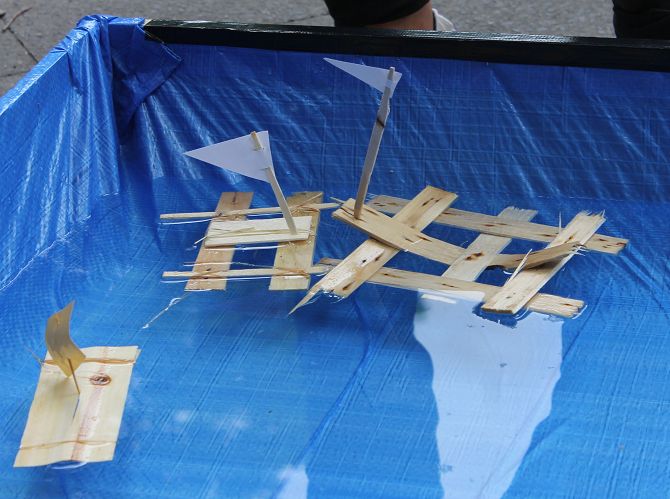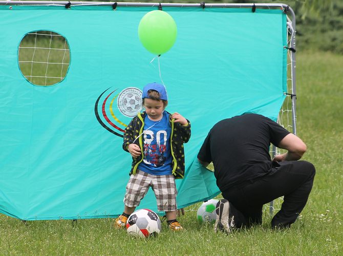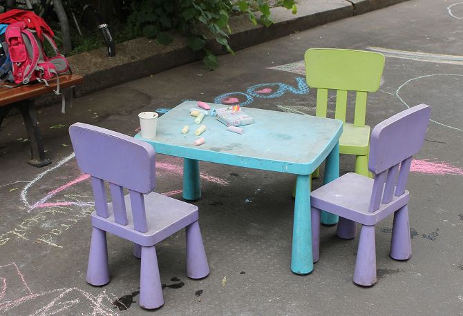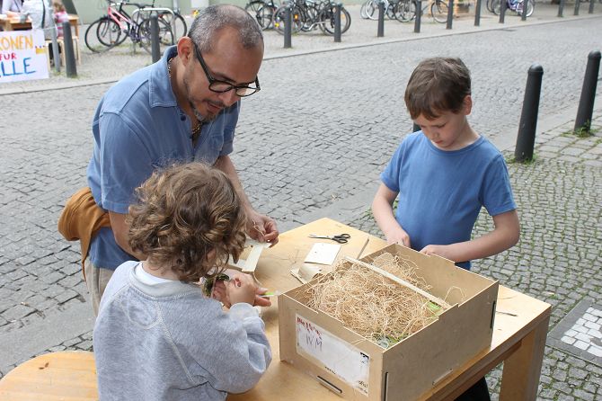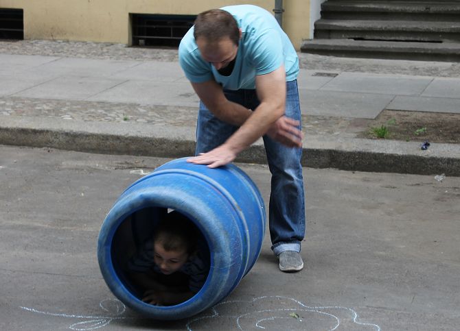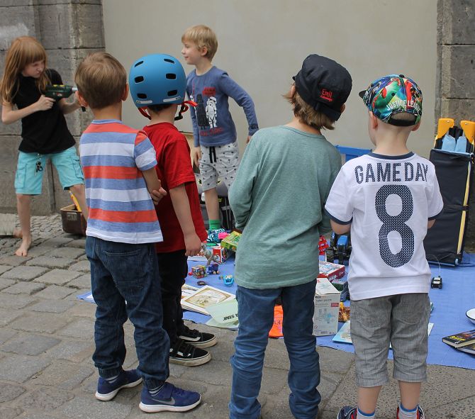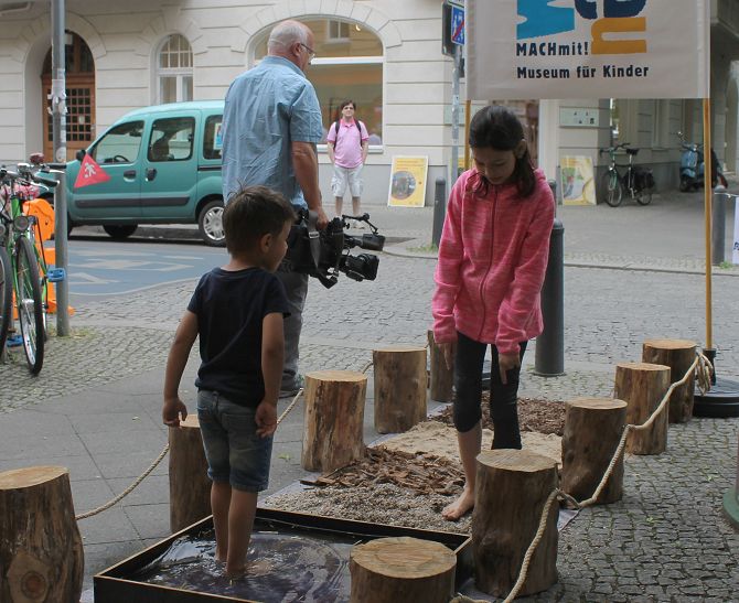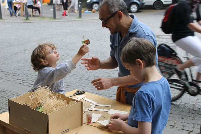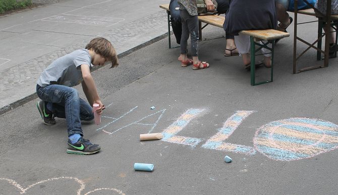 Vor den Machmit!Museum für Kinder ist eine Spielstraße ausgeschildert, was nach heutigen Rechtsverständnis aber nicht bedeutet, dass man da nun unbedingt spielen kann. Oder sollte. Also fand der überwiegende Teil des Kinderfestes auf dem Bürgersteig statt. Dort wurde unter anderem an einem Kasten geleiert, die Kinder konnten barfuß durch künstliche Pfützen waten oder Spanschiffchen bauen. Und selbstverständlich war auch Schminken angesagt.