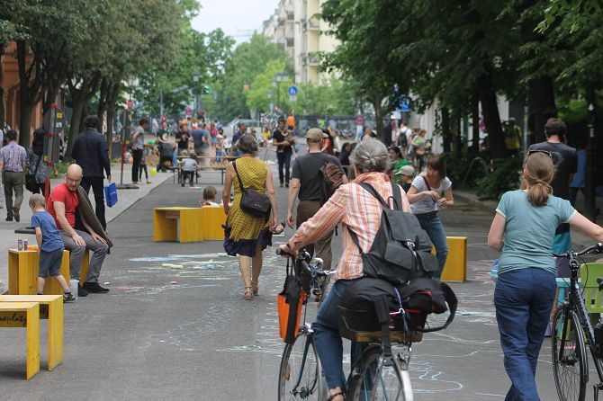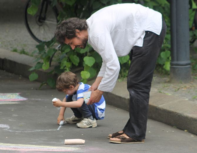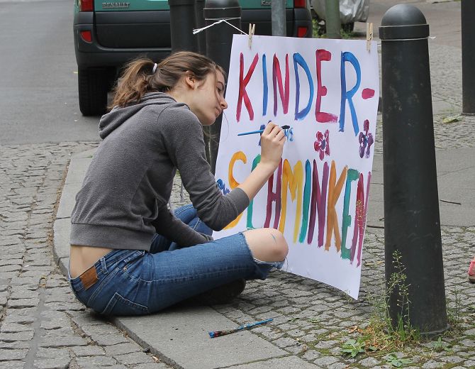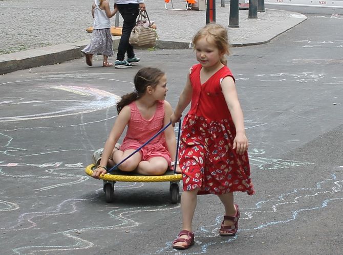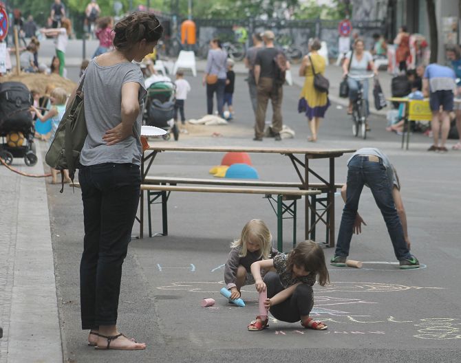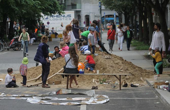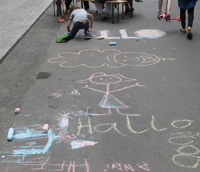 Ohne die störenden Austos, hatten Kinder und Eltern die Muße, den Asphalt mit Kreide zu verschönern, sich in Plastikfässern durch die Gegend rollen zu lassen, Waffeln zu backen um sie hernach zu gepfefferten Preisen zu verkaufen oder eine großen Sandberg zu erobern. Und schminken lassen konnten sich die Kinder auch.