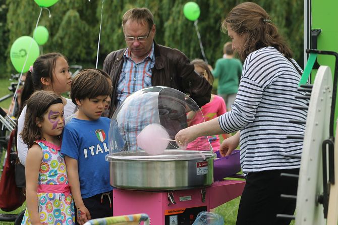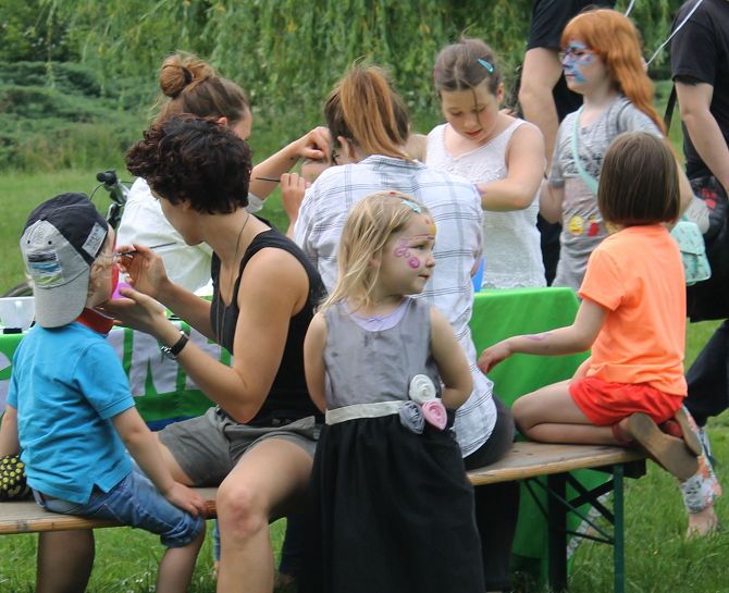Irgendwann erschien dann höchstselbst noch ein leinhaftiger Bezirksstadtrat und hatte ein Wägelchen mit Zuckerwattespinngerät im Schlepptau. Wem er damit wohl was versüßen wollte? Natürlich gab es hier auch eine Möglichkeit, sich schminken zu lassen.