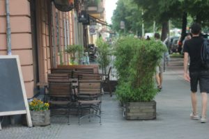 Auch die Pflanzbehältnisse seien zum Teil von einer beachtlichen Stattlichkeit und zuweilen sogar fest im Straßenbelag verankert gewesen. Auch Sonnenschirme, deren Ständer in den Bürgersteig hineinragten und zum Stolpern einluden, seien aufgefallen.Bezirksstadtrat Kühne betonte, dass es ihm bei Pflanzen und Behältnissen nicht um ein paar Zentimeter gehe – aber die Sicht dürfe für Kinder und Rollstuhlfahrer nicht eingeschränkt werden und die Begrünung müsse so beschaffen sein, dass sie im Havariefall von zwei Personen problemlos beiseite geräumt werden kann.