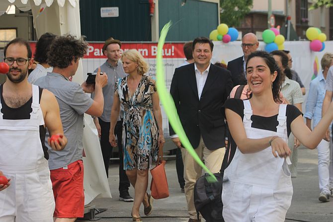Die hatten schon vor einem Jahr die Grundsteinlegung des an der Ecke Grellstraße entstehenden Neubaus der GEWOBAG rhytmisch begleitet. Diesmal tanzte dazu noch eine junge Dame mit einem Flatterband am Stiel, flankiert von einem rote Bälle werfenden Jongleur.