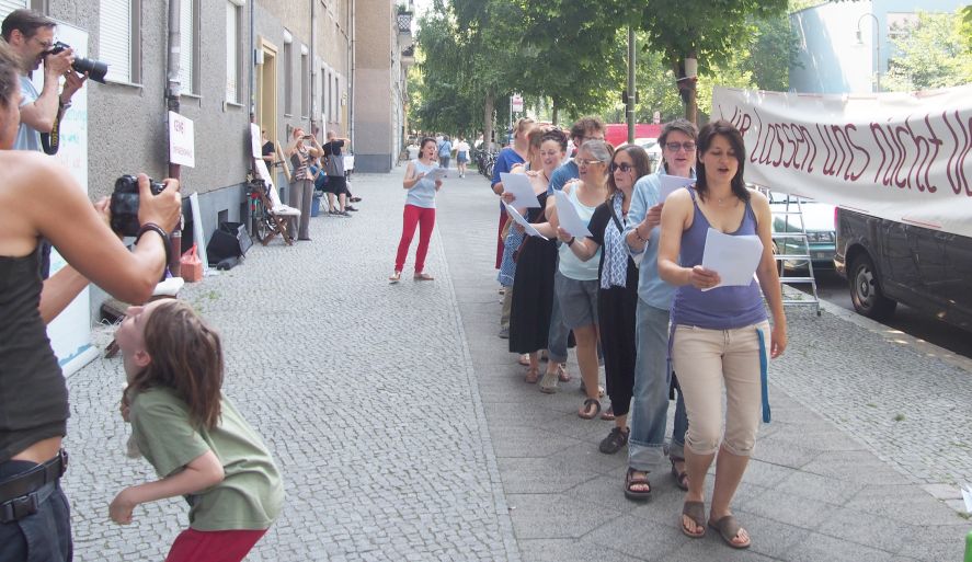 Als der Bus mit dem Senator, den Vorständen der sechs landeseigenen Wohnungsbaugesellschaften und einer Handvoll Journalisten in der Gubitzstraße ankam, waren auch die Trommler wieder da.