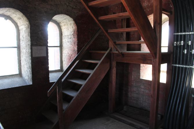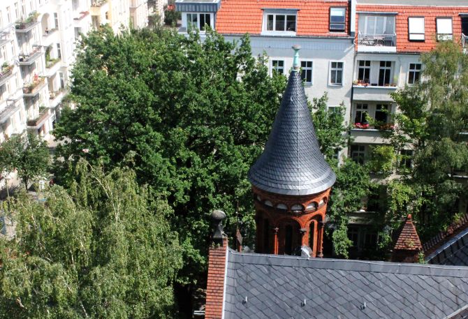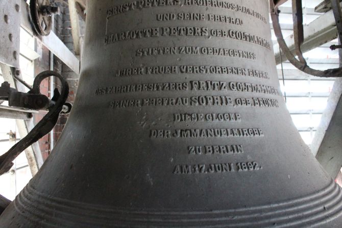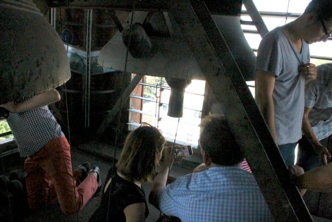 Über eine bei jedem Schritt vibrierende Wendeltreppe, ging es weiter auf knarrenden, über einhundert Jahre alten Holzstufen, um schließlich die letzten Meter bis zur Kirchturmspitze mit einer Baumarkt-Aluminiumleiter zu überwinden. Oben angekommenkonnte man nicht nur den Ausblick über die Dächer von Prenzlauer Berg genießen, sondern auch die Kirchenglocke betrachte und – wenn man Pech hatte – auch hören…