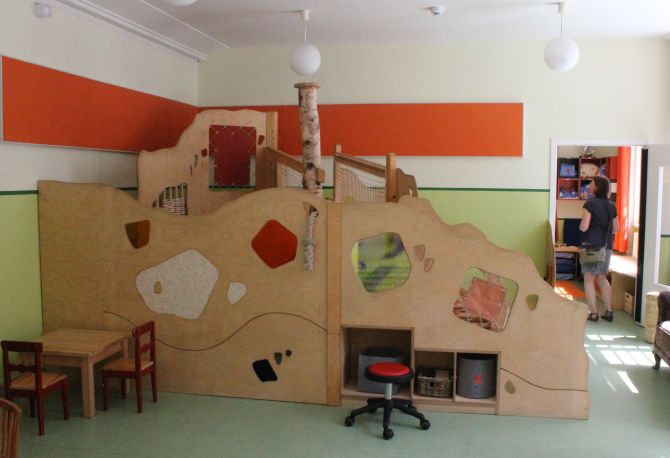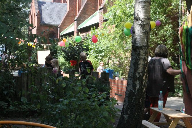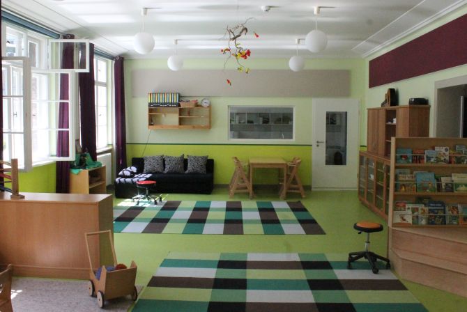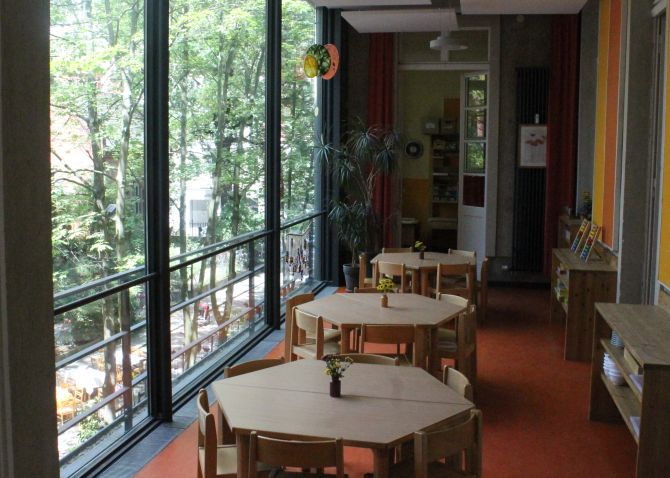 Die Krippe für ein- bis dreijährige Kinder konnte so in einem eigenen Bereich untergebracht werden. Der Umbau wurde durch Landesmittel aus dem Förderprogramm zum Kita-Ausbau finanziert und war mit aufwendigen, mit der Denkmalbehörde abgestimmten Sanierungsmaßnahmen an dem in den 1920er Jahren gebauten Gemeindehaus verbunden. Außerdem wurde ein bislang ungenutzter Hof hinter dem Gebäude als Außen-Spielfläche erschlossen.