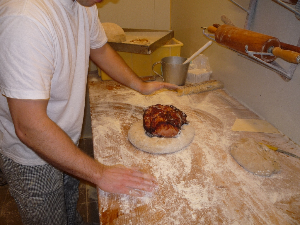 „Prager Schinken“, erklärt Alexander Blank. Es ist eine „Sonderanfertigung“ für einen Kunden. Der hatte das vorgegarte Schinkenfleisch vorbeigebracht, das nun in Brotteig gewickelt und im Ofen gebacken wird.