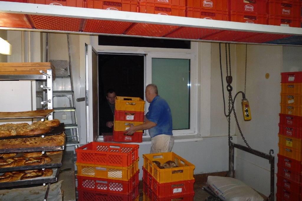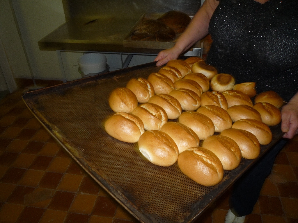 Nun werden die Roggenschrippen – frisch aus dem Ofen gezogen – von Angelika Wettstein in den Verkaufsraum gebracht. Dort befinden sich mittlerweile auch die anderen Ergebnisse der nächtlichen Bäckereiarbeit.