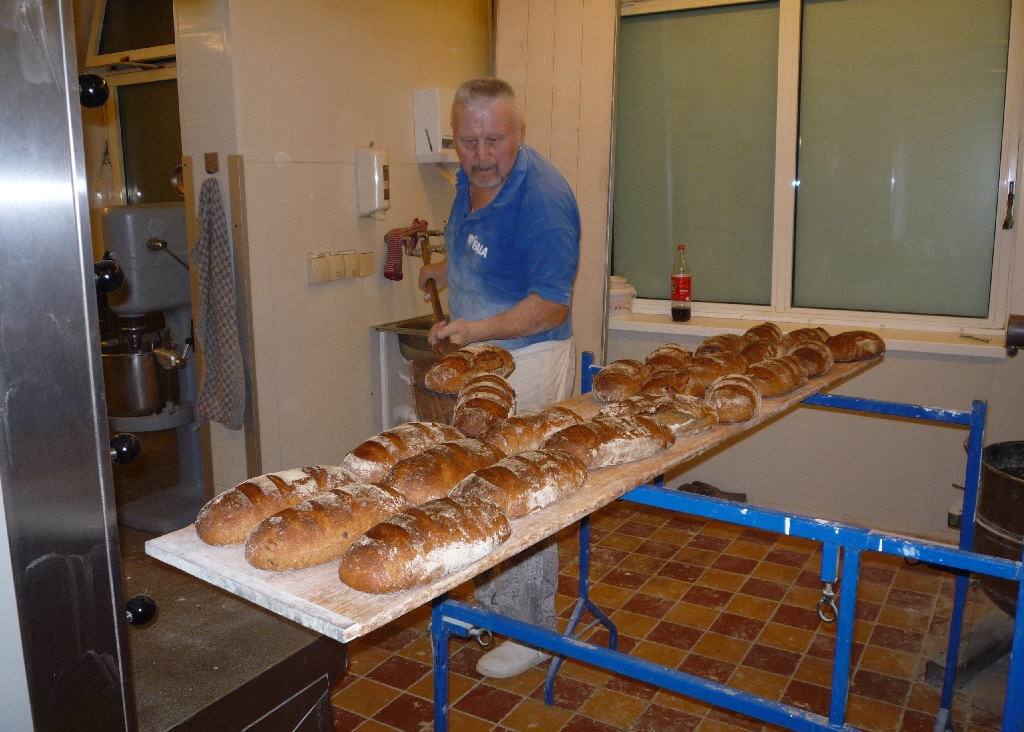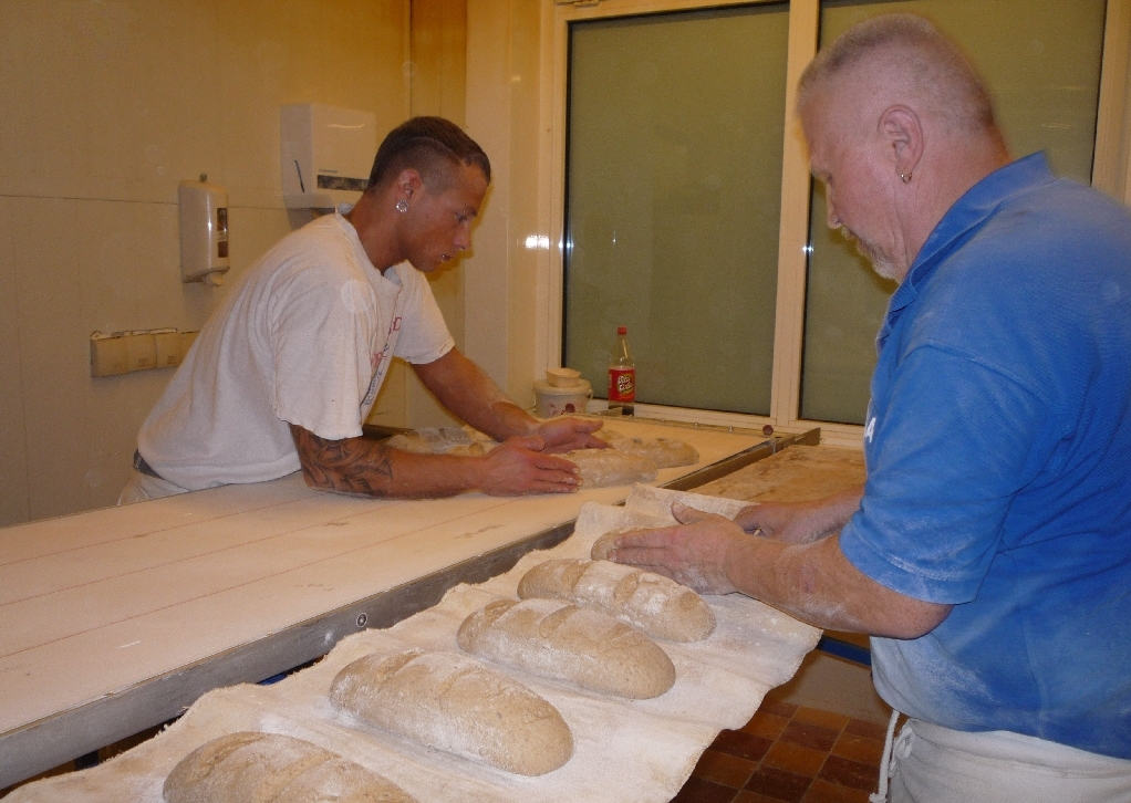 stangen aus dunklem Teig in der Form eines Baguettes? Geselle Klaus Bratner wird sie gleich in den Ofen packen – aber erstmal muss die nächste Ladung Mischbrot raus.