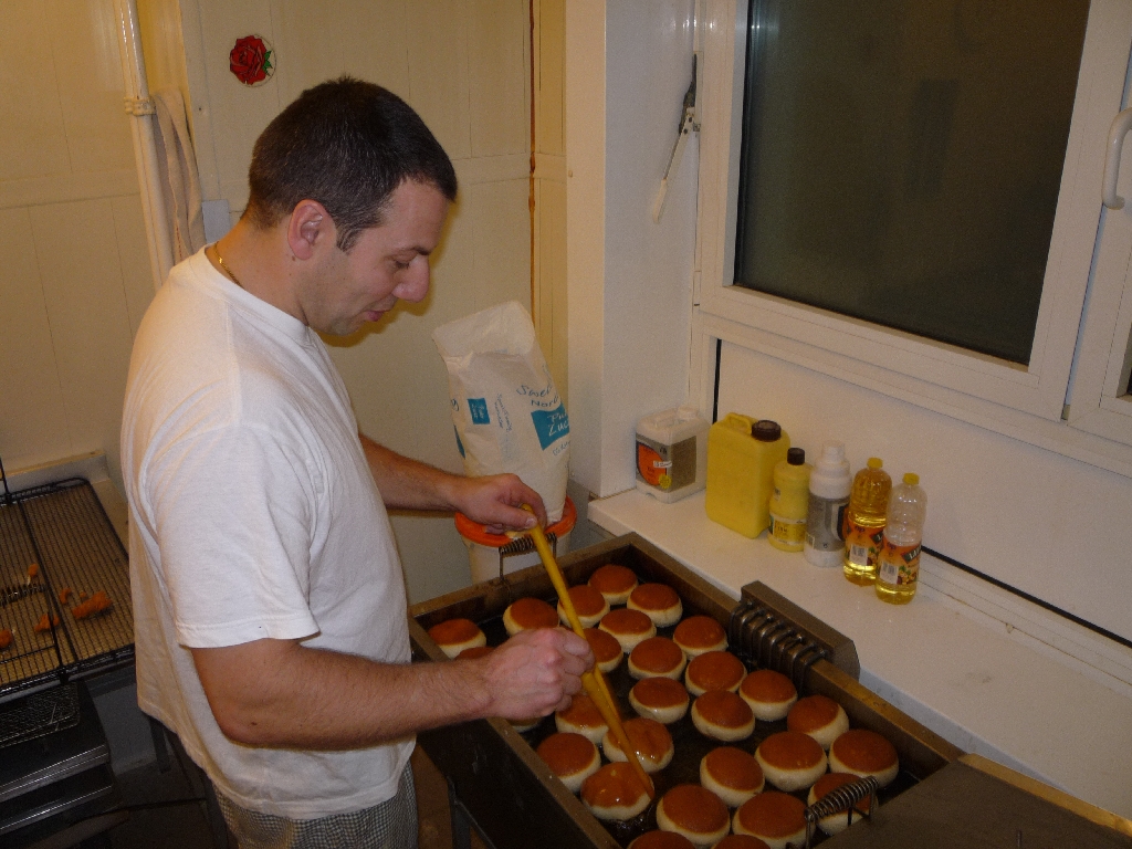 Derjenige, der das alles zu erklären weiß, ist Bäckermeister Alexander Blank, der Inhaber der Bäckerei. Er widmet sich gerade den Pfannkuchen, die in einer heißen Flüssigkeit schwimmen. „Erdnussfett“, sagt der Meister, „die Pfannkuchen sieden wir in Erdnussfett.“ Das hat einen besonders hohen Siedepunkt, so können die kugeligen Kuchenstücken – außerhalb Berlins „Berliner“ genannt – bei 190 Grad „gebacken“ werden.