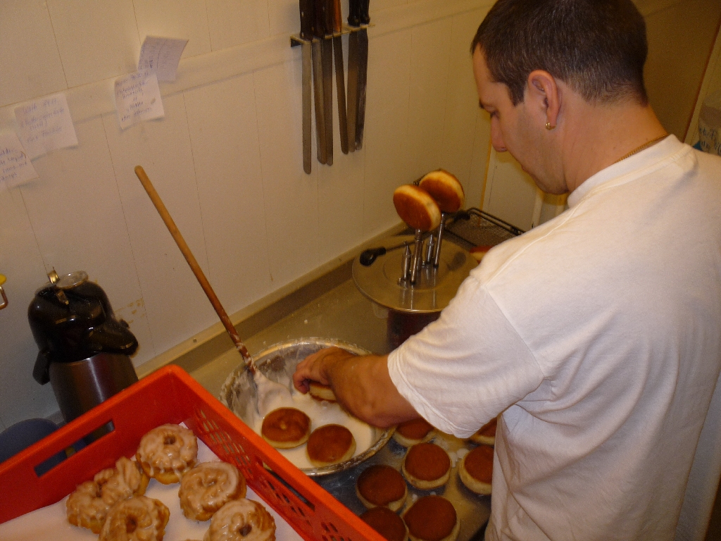 „Je höher die Temperatur, desto schneller bildet sich eine Kruste – so nimmt das Gebäck nur wenig Fett auf.“ Kaum sind die Pfannkuchen soweit abgekühlt, dass man sie anfassen kann, spießt Alexander Blank jeweils zwei von ihnen auf Kanülen auf. Dann ein Druck auf einen Hebel – und fertig ist die Marmeladenfüllung. Danach werden sie noch kurz im Zuckerguss gewälzt – fertig.