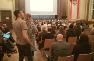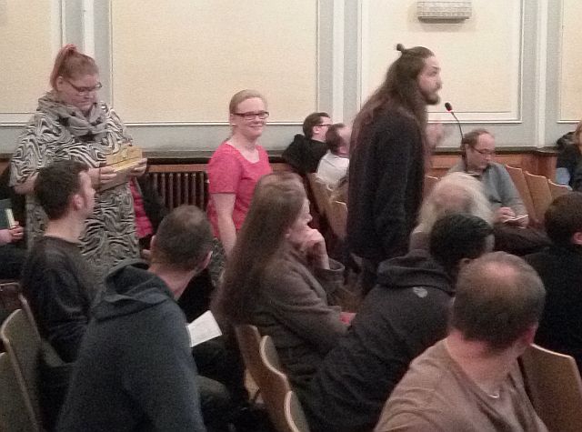 Dann wiederholt die „Deutsche Wohnen“-Sprecherin erneut ihren Dreißig-Prozent-Satz. Es wird unruhig im Saal und der Mieter legt nach: „Dann kann ja hinterher irgend einer kommen uns die Vereinbarung zeigen und sagen, eine Härtefallregelung gibt es für Sie nicht, denn Sie haben ja nur den normalen Standard.“