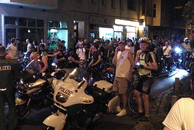 Nein, bloß eine Demonstrationeine Nachts um 22.30 Uhr. Über 100 Menschen auf Fahrrädern demonstrieren gegen… ja, was eigentlich?