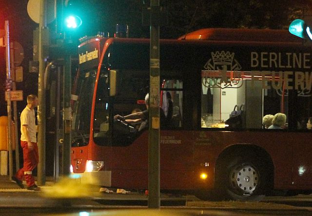 An der Absperrung zur „Sicherheitszone“ in der Berliner Straße ist die Lage auch kurz nach 23.00 Uhr noch unverändert. Gegen 23.30 Uhr kommt ein Shuttlebus der Feuerwehr an der Berliner Straße vorbei, hält an der Ecke Esplanade, die Dame mit dem Rollator steigt ein. Es geht in die Fröbelstraße.