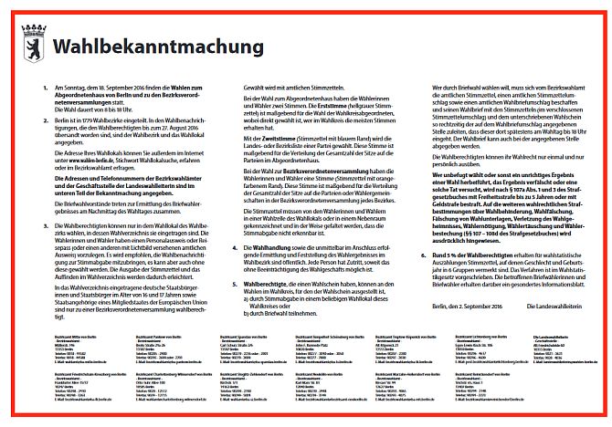 Damit das auch jeder (und natürlich auch jede – schließlich existiert auch in Berlin schon seit geraumer Zeit das Frauenwahlrecht) mitbekommt, wird die entsprechende Information seit Anfang dieser Woche mit Hilfe von Plakaten weitergegeben. Plakate von der Landeswahlleiterin. Auf denen steht, das Wahlen bevorstehen.