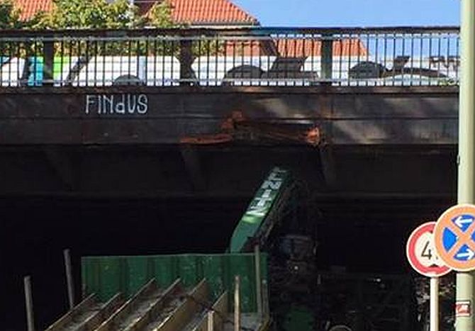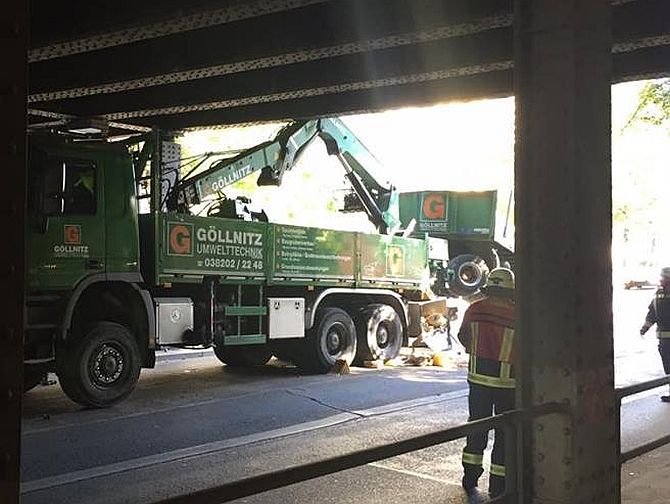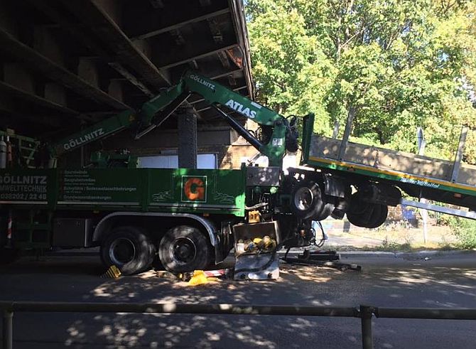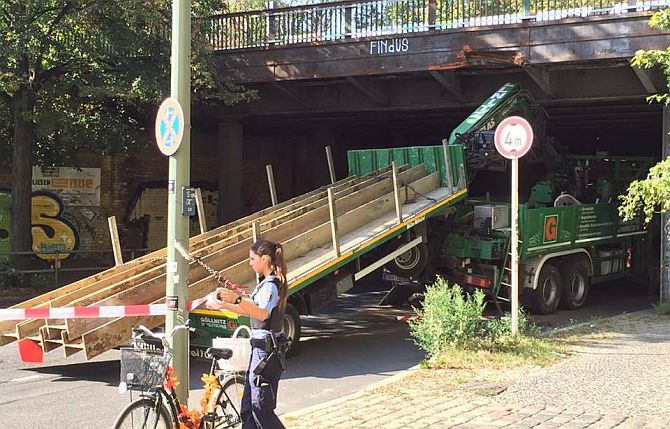 Kurz nach 14 Uhr verkeilte sich am heutigen Dienstag ein LKW mit seinem Kranarm in der Brückenunterführung in der Pankower Mühlenstraße. Dem Anschein nach hatte der Fahrer die Höhe der Brücke über- oder aber die des Kranarmes unterschätzt.