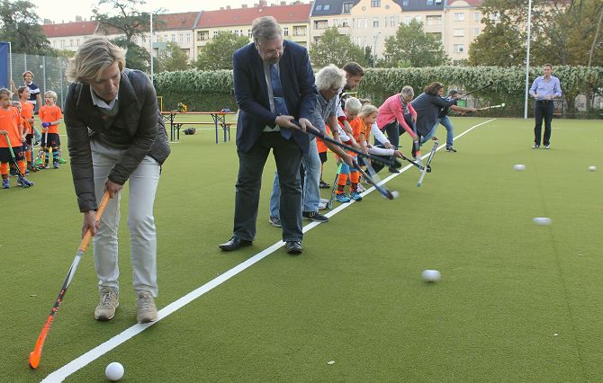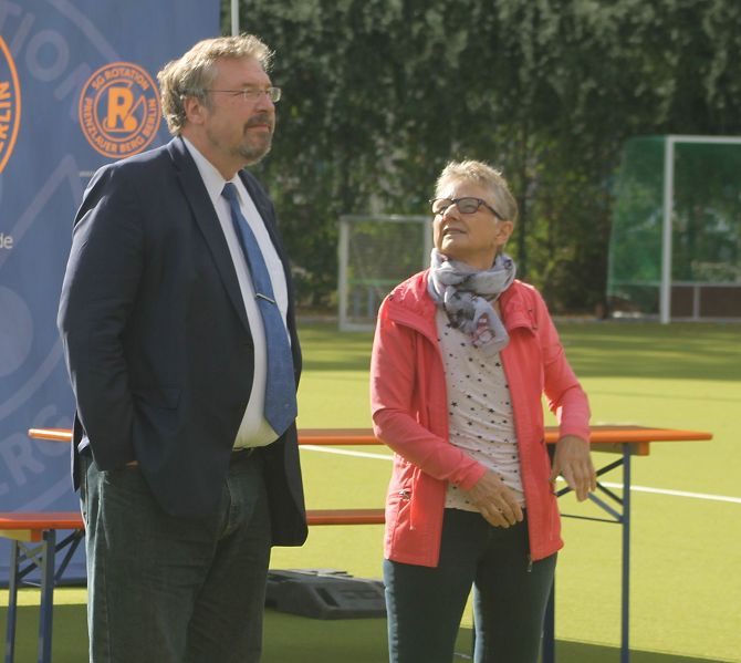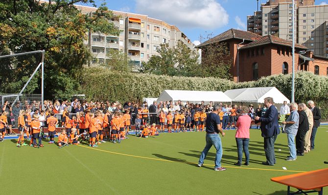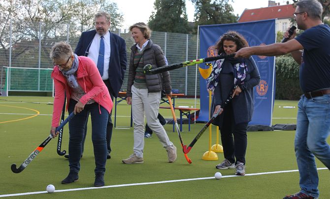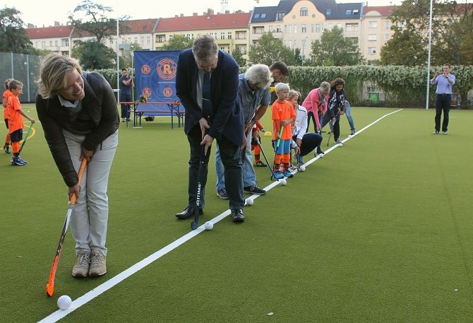 Am Montag wurde der neugestaltete Hockeyplatz an der Ella-Kay-Straße in unmittelbarer Nähe des Thälmannparks offiziell eingeweiht. Mit einem ganz großen Bahnhof: Vom Senat erschien Sport-Staatssekretär Andreas Statzkowski, Bezirksstadträtin Lioba Zürn-Kasztantowicz war auch da und freute sich, dass anders als im Kissingenstadion – bei dieser Eröffnung der Platz bei tatsächlich auch schon fertiggestellt ist…