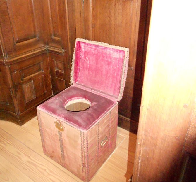 Foto oben: Toilette von König Wilhelm III. von England mit samtbespanntem Sitz, Hampton Court, London