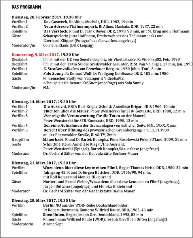 Dazu sind die Veranstalter sozusagen außer Landes gegangen: Ein paar Meter südlich von Prenzlauer Berg zum Rosa-Luxemburg-Platz in Mitte.Im wunderschönen alten Filmtheater „Babylon“ werden beginnend vom 28 Februar bis zum 28. März an vier Abenden (einer je Woche) Spielfilme und Dokumentationen mit Bezug zu Prenzlauer Berg zu sehen sein. Eine Nachwendeproduktion folgt drei DEFA-Filmen, alles hat irgendwie etwas mit „Liebe, Alltag und Sozialismus“ zu tun.