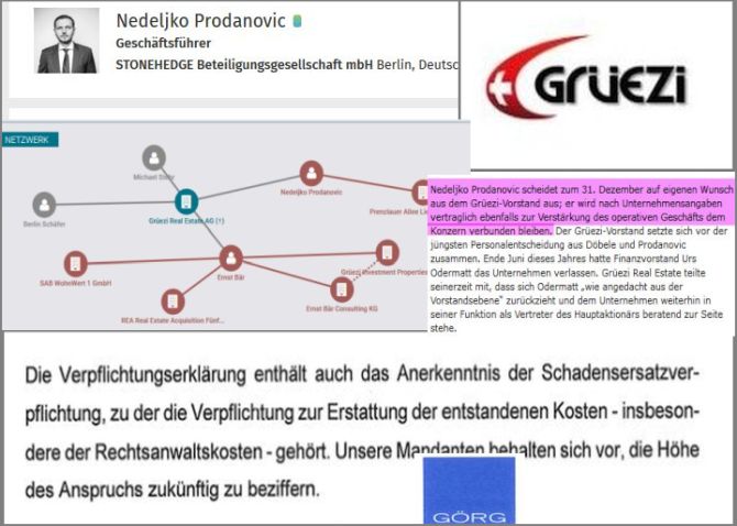 „Auch war Prodanovic bis Ende 2009 Vorstand der Grüezi Real Estate AG, ein Unternehmen, das durch massenhafte Betrügereien mit sogenannten Schrottimmobilien bekannt geworden ist.“