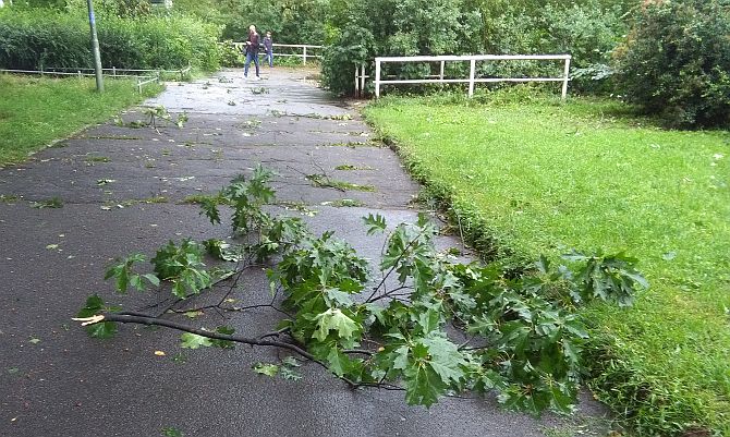So hatte in der Breite Straße in Pankow in Höhe Kavalierstraße ein schwerer herabstürzender Ast die Oberleitung der Straßenbahnlinie 50 blockiert.