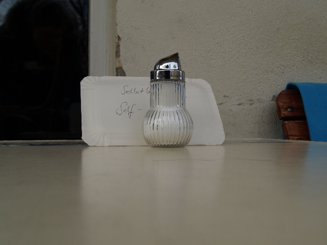 - Pommes, Ketchup, weißer Sand