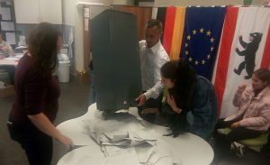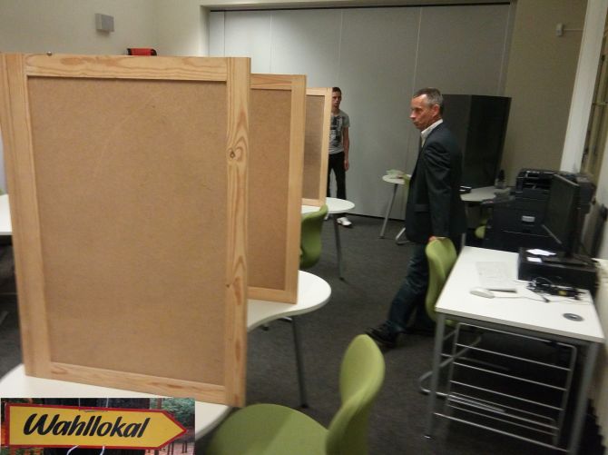 Dann werden die seit einem Jahr in irgend einer Ecke überwintert habenden Wahlurnen entstaubt. Kurzer Blick ins Innere, ob sich da nicht vielleicht noch ein ein Wahlzettel von der Abgeordnetenhauswahl des vergangenen Jahres versteckt haban.