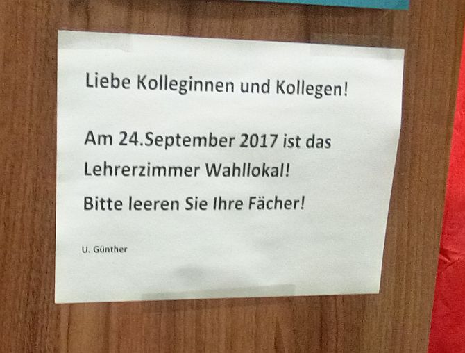 In zwei Lehrerzimmern des Schulgebäudes müssen die Wahllokale der Wahlbezirke 713 und 720 eingerichtet werden. An einem Regal ein angepinnter Zettel, der die Lehrerinnen und Lehrer zur Ordnung rufen sollte: „Bitte leeren Sie Ihre Fächer“.