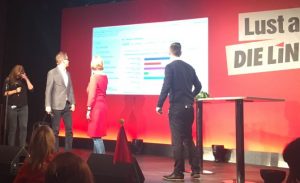 Die Pankower Linken, die keine eigene Wahlparty ausrichteten, feierten auf der Landesveranstaltung im Festsaal Kreuzberg. Als die Prenzlberger Stimme dort gegen 22 Uhr eintraf, verließ gerade ein aufgeräumt wirkender Stefan Liebich das Gelände. Mit 28,8 der Wählerstimmen im Wahlkreis 76 (plus 0,4 Prozent) hatte er einen Abstand von 9,2 Prozent zum Zweitplatzierten von der CDU souverän den Wahlkreis zum dritten Mal gewonnen. Auch seine Partei kam ganz gut weg. In Pankow erlitt sie zwar einen leichten Verlust von 1,7 Prozent, steht aber mit 23,4 der abgegebenen Wählerstimmen an der Spitze. Im Land Berlin hingegen ist die Linke(18,8) nun an der SPD (17,9) vorbeigezogen. Trotz eines Verlustes von 5.7 Prozent steht hier die CDU mit 22,7 Prozent an der Spitze.