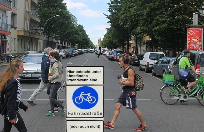 Fahrradstraßen sind ganz gewöhnliche Straßen, in denen der Radverkehr Vorrang hat. Offiziell dürfen nur PKW von Anwohnern solche besonderen Fahrradzonen befahren – wer allerdings einmal in der zur Fahrradstraße umgewidmeten Choriner Straße den Verkehr beobachtet hat, weiß, dass das eher ein Wunsch, denn eine durchsetzungsfähige Anordnung ist.