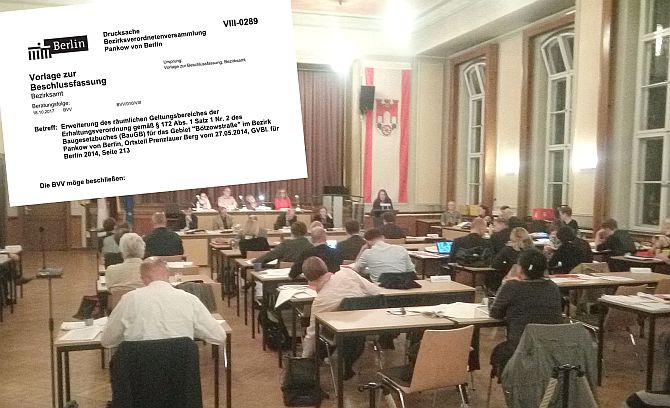 Die Einrichtung der drei neuen Erhaltungsgebiete Komponistenviertel, Langhansstraße (beide Weißensee) und Pankow Süd sowie die Erweiterung der Prenzlauer Berger Milieuschutzgebiete, Bötzowstraße und Humannplatz (die Prenzlberger Stimme berichtete) wurden am Mittwoch erwartungsgemäß mit den Stimmen der rotrotgrünen Zählgemeinschaft von der Pankower Bezirksverordnetenversammlung (BVV) beschlossen.