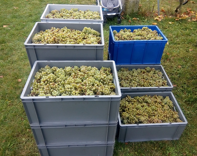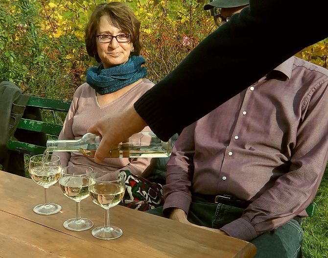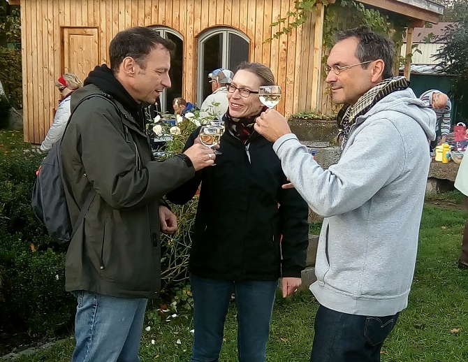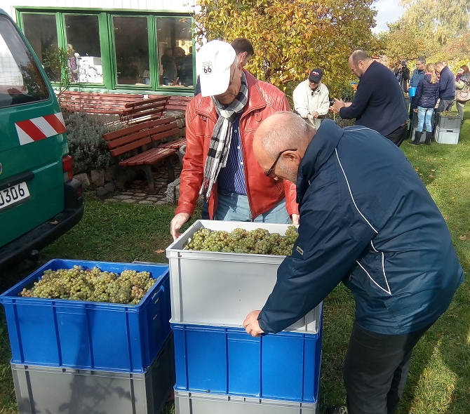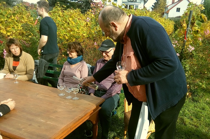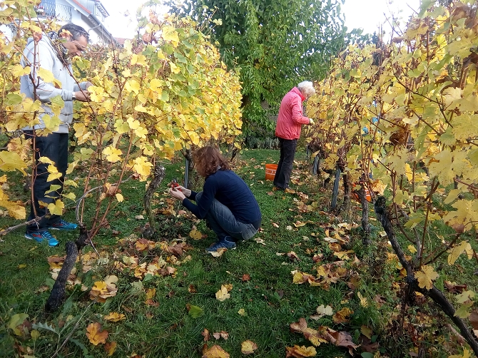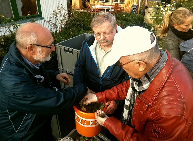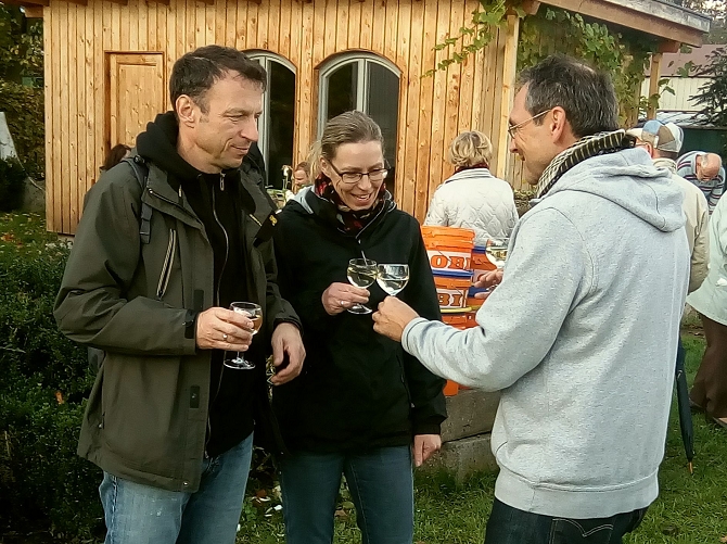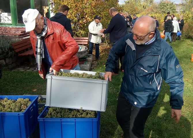 Mit Wehmut erinnerte sich da mancher an das vergangene Jahr, als mit über 1.000 Kilogramm mehr als das Dreifache gelesen wurde. Dass der 2016er Jahrgang mit gut 80 Grad Oechsle auch einen süffigen Wein hervorgebracht hatte – davon konnten sich die Erntehelfer vor Ort überzeugen.