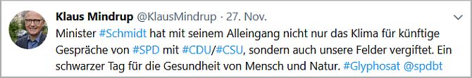 Nicht weniger bemerkenswert ist das Posting, das der Pankower SPD-MdB Klaus Mindrup beim Bekanntwerden des Alleingangs des Bundeslandwirtschaftsministers in die sozialen Medien Twitter ud Facebook gesetzt hat: