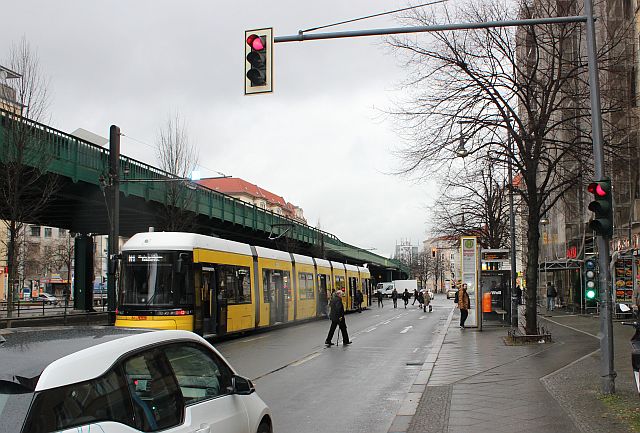 Ähnliches sieht der Antrag für die Kreuzung Schönhauser Allee/Wisbyer/Bornholmer Straße vor: Verlegung des Straßenbahnausstiegs unter das U-Bahnviadukt, danach Begradigung des Radwegs und Entfernung der „Pförtnerampel“. Damit das auch in beiden Richtungen funktioniert, soll die stadteinwärts fahrende Bahn erst hinter der Kreuzung Halt machen.
