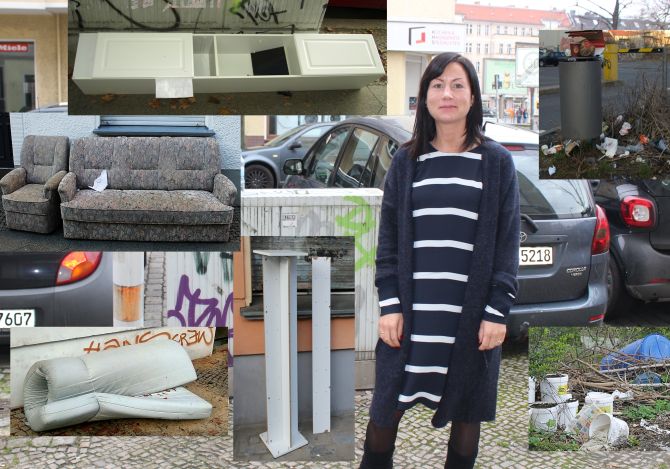 Weil: Clara West sucht aus irgendwelchen Gründen aktuelle Müllfotos aus dem Raum Prenzlauer Berg. Also Bilder, wie man sie hier jeden Tag schießen kann: Von versifften Sofas auf dem Bürgersteig, zerfallenen Regalteilen an der Hauswand, sich am Rinnstein wälzenden Altmatratzen oder Abfallbehälter mit Brechdurchfall.