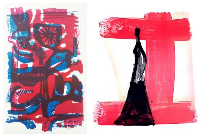 Abb. oben: Bernd Friedrich, Totem 8-18, 1970, Zweifarblithographie, 33 x 22 cm (links); Linde Bischof, o.T., 2002, Lithographie 3-farbig, 40 x 34 cm (rechts)