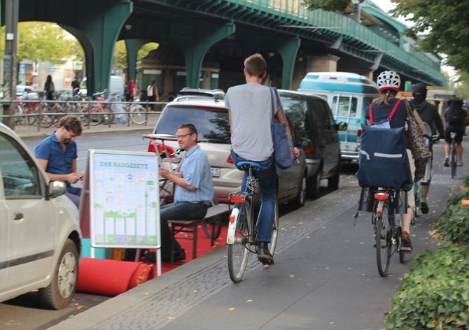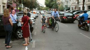 Auf der Stargarder Straße waren es Leute vom Netzwerk Fahrradfreundliches Pankow, von der BI Gethsemaneplatz und dem Verein „autofrei leben!“, die sich zwischen die parkenden Karossen gezängt hatten.