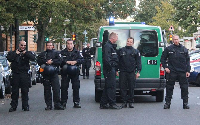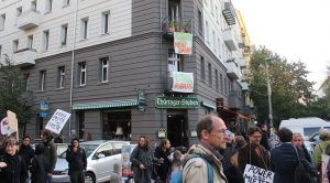 Beginnend am Haus Kollwitzstraße 2, das vor drei Jahren in die Schlagzeilen kam, weil der seinerzeitige Eigentümer das Haus illegal in Eigentumswohnungen umwandeln wollte, das Haus verkommen ließ um die Mieter so zum Auszug zu bewegen, zog die Demonstranten wieter zur der Belforter Straße.