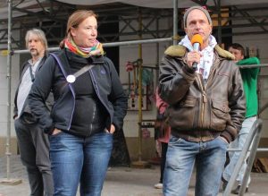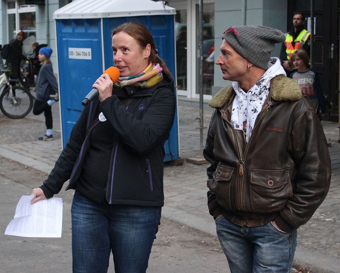 Mietrechtsanwältin Carola Handwerg, die die Mieter damals vertrat, wies in ihrem Statement vor der Winsstraße 59 auf die verschärfte Rechtsprechung des Bundesgerichtshofs bezüglich von Wohnungskündigungen hin und forderte von der Politik, hier gesetzliche Änderungen herbeizuführen.