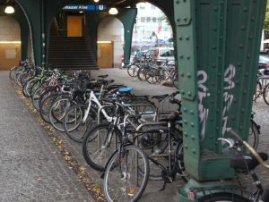 Auf den ersten Blick erscheint auch unter dem U-Bahn-Viadukt, dem „Magistratsschirm“, die Situation nicht viel besser: Vom U-Bahnhofszugang bis hin zur Kreuzung Wichertstraße/Schönhauser Allee ist das Angebot an Fahrradbügel tagsüber praktisch ausgebucht. Im Umsteigebereich zur S-Bahn sind auch die Begrenzungsgitter von Fahrradschlössern eng umschlungen.