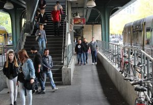 Offenbar wirkt die Rolltreppe als optische und psychologische Barriere. Da, wo sich der Straßenübergang mit dem Übergang von U- und S-Bahn kreuzt, ist schlicht nicht zu erkennen, dass sich hinter der Rolltreppe noch leere Fahrradbügel befinden. Hinzu kommt, dass man sich mit dem Fahrrad erst durch die schmalen Gänge zwischen bugsieren muss, was gerade bei starkem Umsteigeverkehr hemmend wirkt.