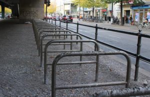Von der Rolltreppe bis hin zur Kreuzung Stargarder Straße stehen die Fahrradbügel – sieht man mal vom dicken Taubenkot ab – völlig nackt in der Gegend herum und langweilen sich.