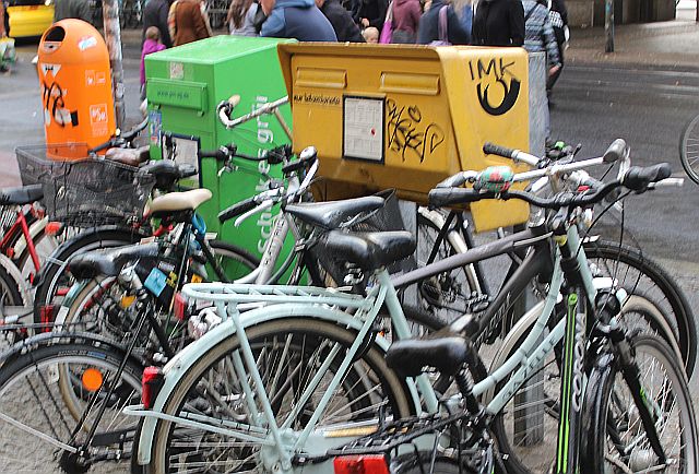 Das wird regelmäßig eng für die Passanten, und wer am Morgen sein Rad noch relativ frei an einen Bügel angeschlossen hatte, muss sich am Nachmittag durch die davor gestellten Räder graben.