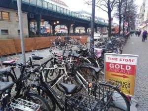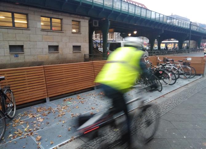 Denn zwischen Bürgersteig und Radweg befindet sich eine schier undurchdringliche „Mauer“ aus abgestellten Fahrrädern. Wer sein Rad auf dem Parklet abstellt, muss also nicht nur danach die Fahrradspur überqueren, sondern dazu noch einige Meter auf eben diesem stark frequentierten Radverkehrsweg entlangspazieren, um auf den Füßgängerbereich zu gelangen. Das ist gefährlich für die da vorbeirauschenden Radfahrer und natürlich erst recht für diejenigen, die nach dem Abstellen ihre Fahrrades gezungen sind, diesen Weg zu nehmen.