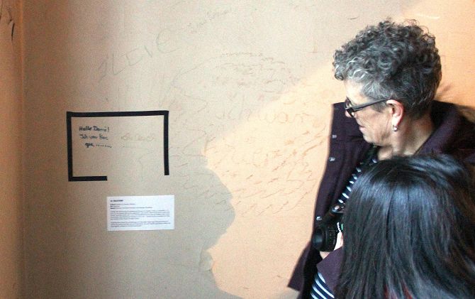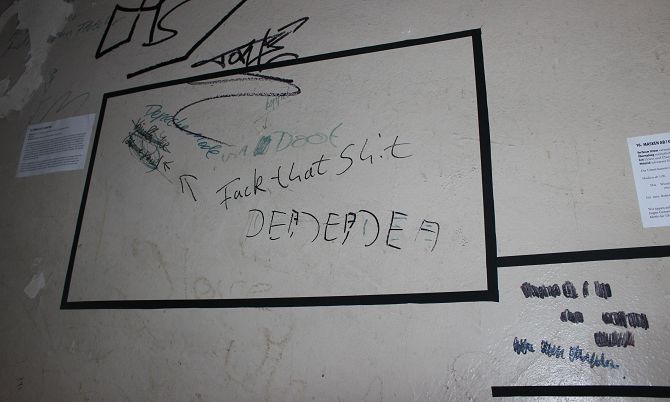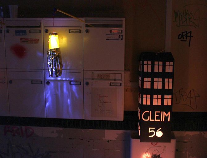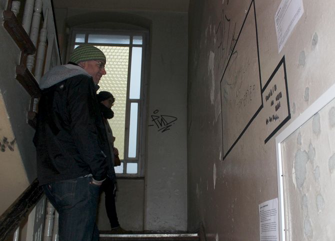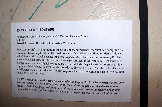 In der Gleimstraße 56 gab es die Ausstellung „HOME IS WHERE YOUR HEART IS“ zu bewundern. Dabei wurden offenbar schon länger an den Hausflurwänden vorhandene Inschriften und Mini-Grafitti gerahmt und mit mehr oder weniger ironischen Kommentaren versehen.